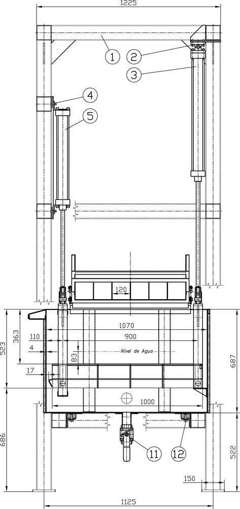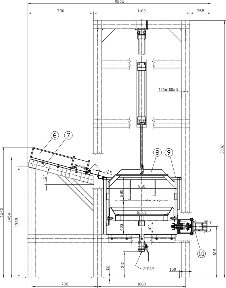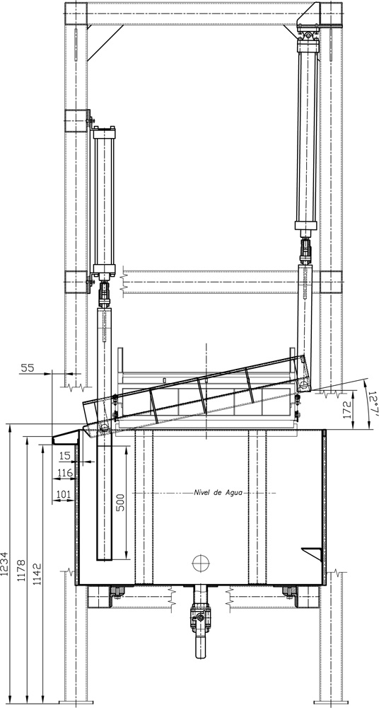 El nivel de agua indicado es el recomendado de acuerdo a las condiciones mecánicas del equipo, permitiendo aumentar o disminuir el volumen de acuerdo a la experiencia con cada producto a lavar. En el diseño se consideró también que la altura de salpicado durante la agitación no supere la batea.