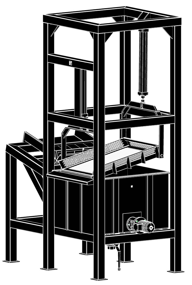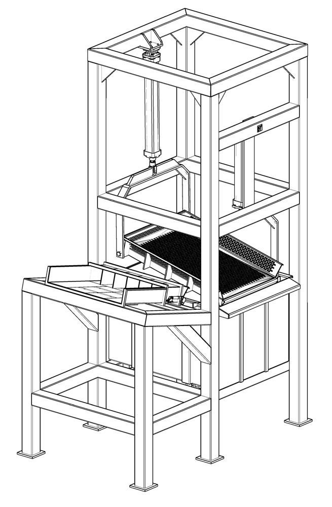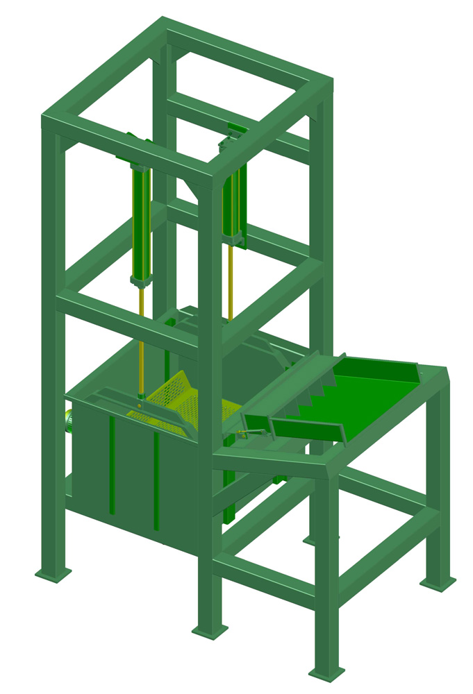 En la opción de lavado de verduras, las mismas no pueden superar los 800 milímetros de largo debido a la geometría de la canasta. Dado que la carga es directa, ya que el dosificador no cumple su función, se realiza con la batea sumergida, la cual recoge las verduras lavadas en su recorrido de izaje. El ascenso de la canasta se realiza a través de dos guías que orientan el brazo frontal, descubriendo en el inferior de las guías los topes que limitan el recorrido de descenso. Lo mismo se detalla en el tope interior de la batea, garantizando así que el agitador nunca tendrá contacto con la canasta.